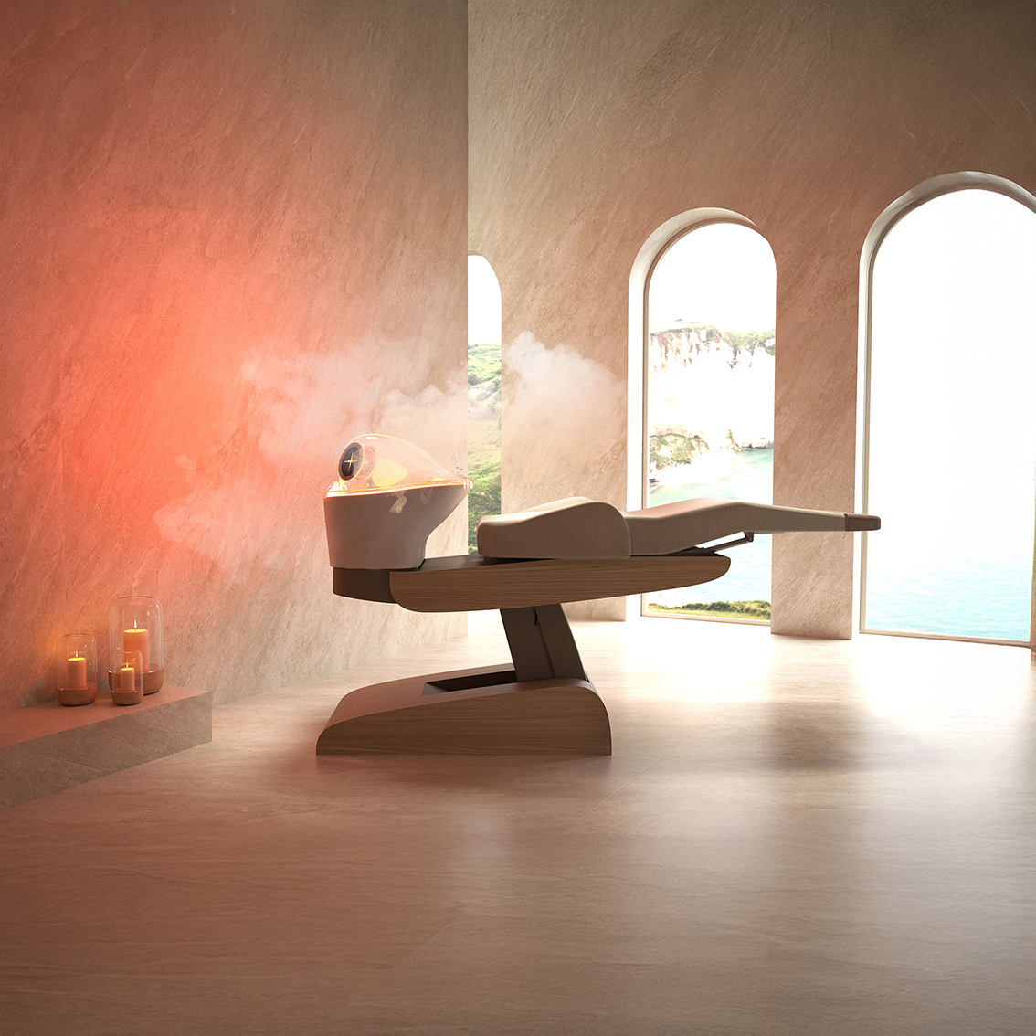 e un sistema a vapore VAPOMIST per amplificare i benefici dei trattamenti, mentre una cuffia IGLOO indossata sulla testa – attraverso la quale il professionista può raggiungere il cuoio capelluto per massaggiarlo – migliora l'esperienza. L'unità è progettata con sedile, schienale e poggiagambe completamente articolati per garantire comfort e una postura ottimale ai clienti durante i trattamenti, mentre l'altezza regolabile consente al professionista di lavorare comodamente sia da seduto che in piedi. La giuria ha definito il design e il concetto “straordinari” e ha sottolineato che gli elementi in legno e ceramica creano un “design raffinato” che i consumatori “adoreranno”.